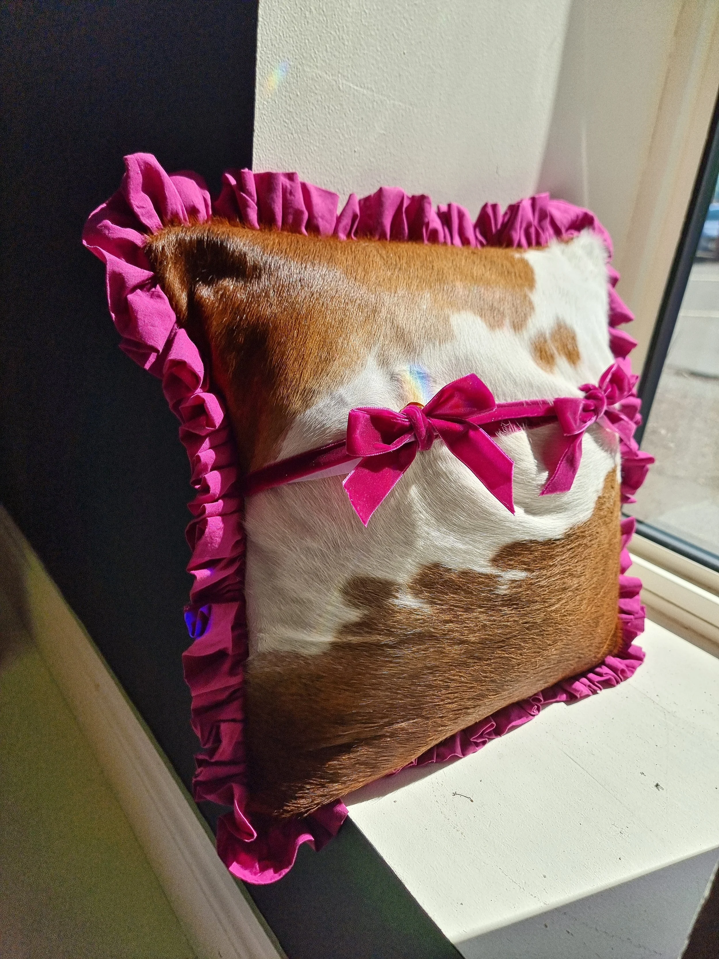 Introducing our most beautiful collection yet β luxurious double-sided cowhide cushions, with frilly trimmed edges and velvet bow fastenings.